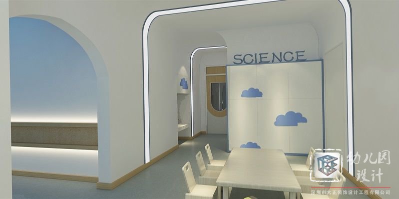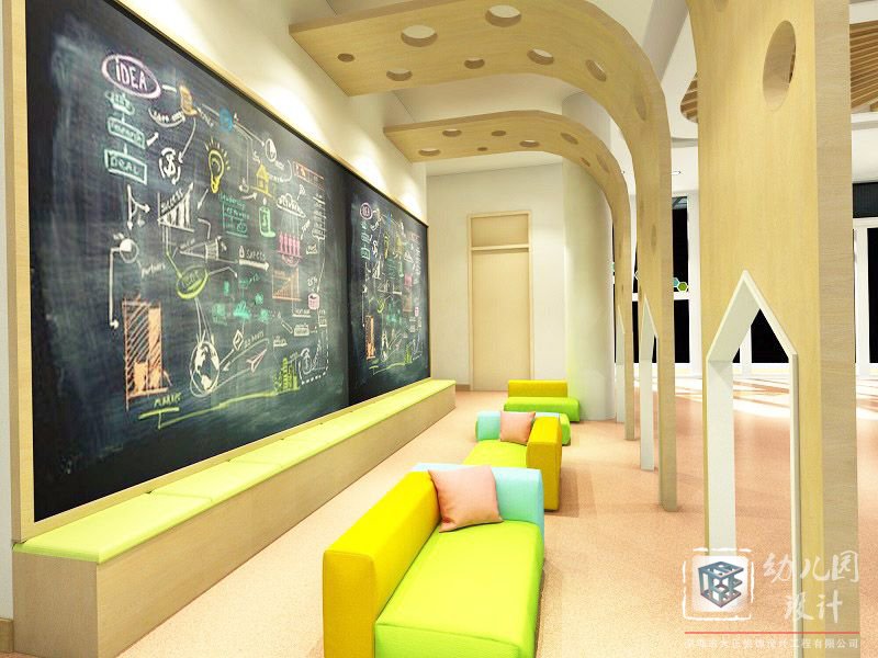 親切感的營造可以借助色彩、材料以及造型來實(shí)現(xiàn),例如許多幼兒園設(shè)計(jì)中的色彩多為原木色,大量木材的使用,增加了室內(nèi)環(huán)境的親切感。而幼兒熟悉的造型元素如云朵、圓形等的使用,在增加親切感的同時(shí)也提高了空間趣味性,趣味性主要是通過刺激兒童的感官和想象力來塑造,趣味造型的表達(dá)、色彩的渲染,具有變化的景觀小品都可以充分激發(fā)兒童的認(rèn)知潛能和想象力,達(dá)到教育開發(fā)引導(dǎo)的意義。