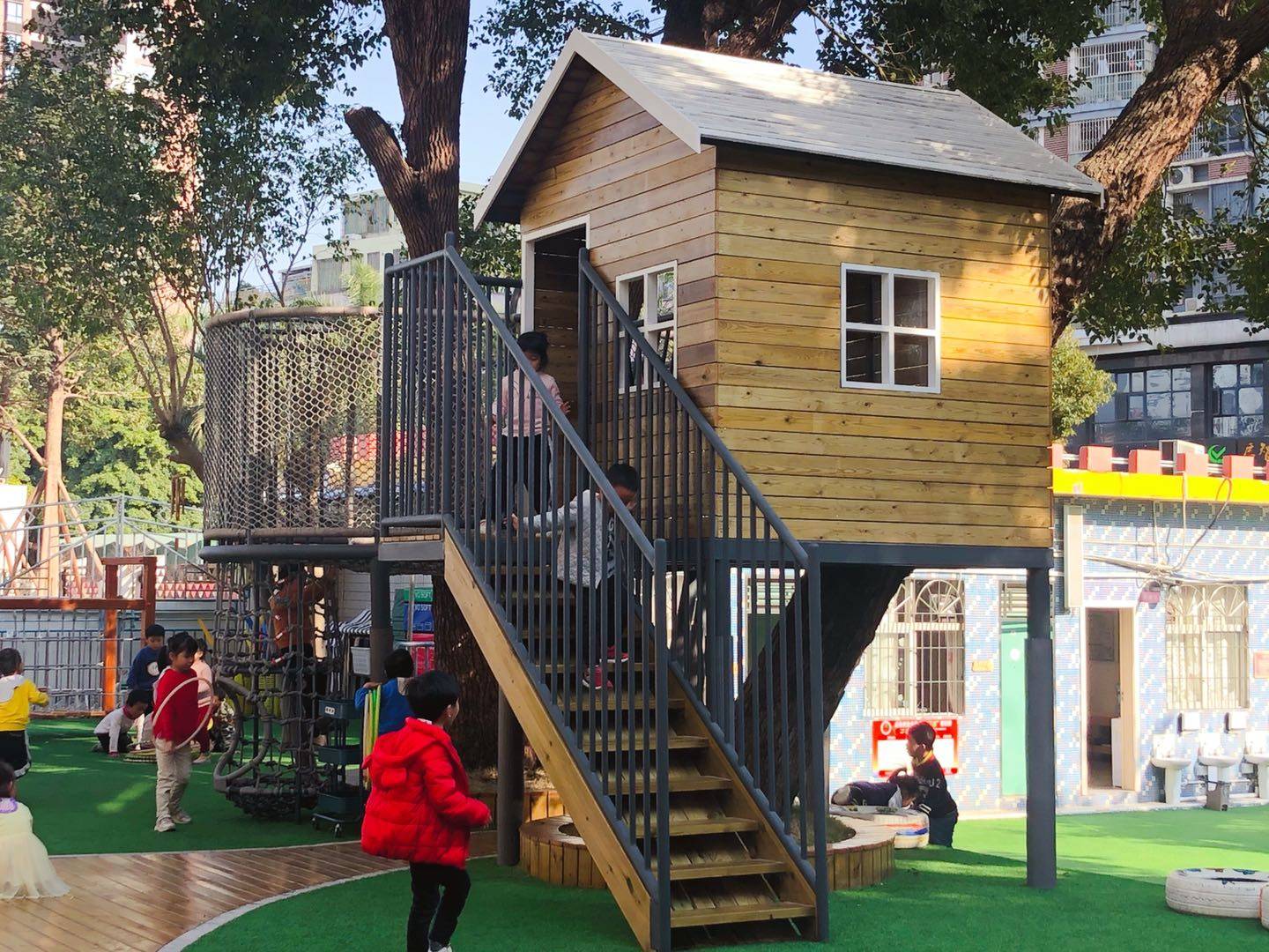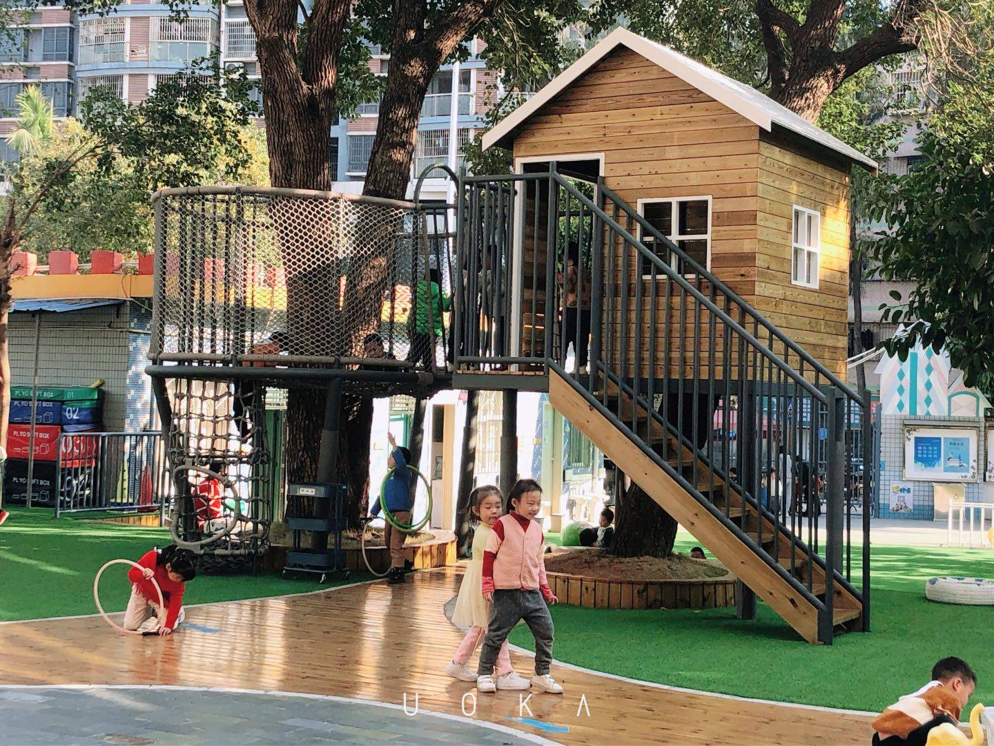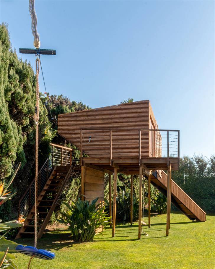 樹屋建成后結(jié)合其他的探索設(shè)施,在使用的過程中,它們會(huì)以多種方式使用大腦和身體,而不是使其單一或者純粹地以健康為目的,可以讓快樂持續(xù),在不知不覺中促使孩子們鍛煉。