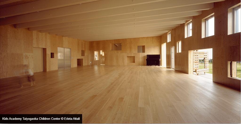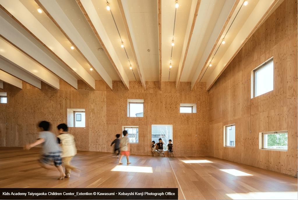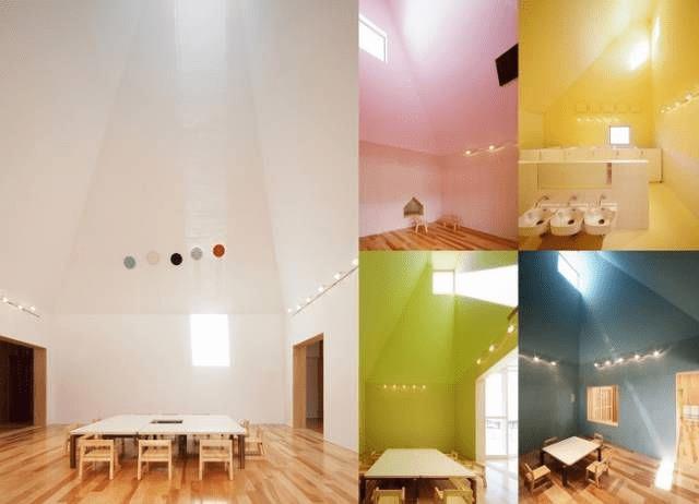 讓光線在室內(nèi)發(fā)生位移的設(shè)計(jì)手法Archivision Hirotani Studio在長(zhǎng)濱設(shè)計(jì)的保育園中也在使用,保育園里的有許多不一樣的教室,傾斜的天花板代替了水平的天花板,人們的視線順著天花板的角度延伸向上,陽(yáng)光透過(guò)不同朝向的天窗,在室內(nèi),孩子們可以感覺到光線的變化。