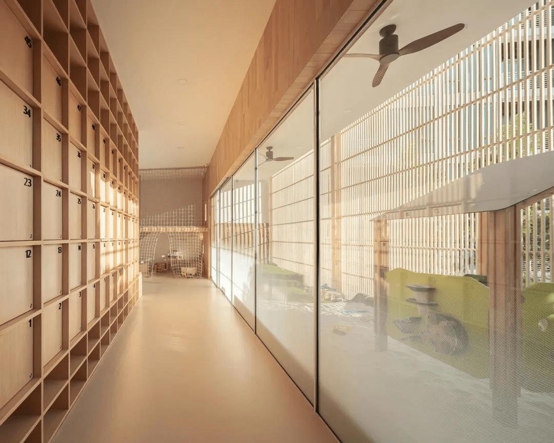 這種利用遮擋物的疏密造型來(lái)獲取光斑或者影子的手法越南的這個(gè)幼兒園也在使用。