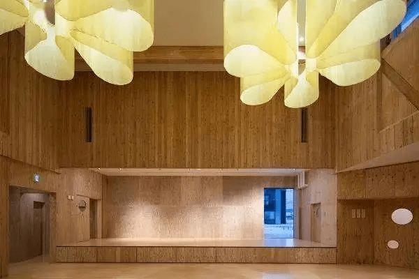 上面的做法都是基于引入自然光的需求上再變化出一些花樣,在人工照明上也可以利用材料的特性改變光。隈研吾在北海道北龍町立Yawara幼兒園大廳的燈具上使用了暖黃色的布料,它們?cè)谔旎ò迳媳粩[出花朵的形貌,散射出來(lái)的光線也因此發(fā)生了改變,暖黃色的布料也使得燈光變得更加柔和。