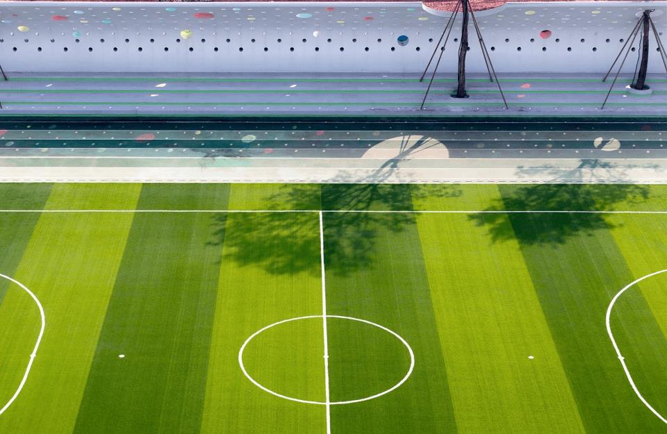成都哈密爾頓麓湖學(xué)校看臺(tái)升起的那面弧形的頂棚嵌入了大小不一色彩各異的小園窗,隨著光線的流動(dòng),彩色的光斑會(huì)印在操場(chǎng)上,隨著太陽(yáng)的高度、方位的變化,這片色彩迷宮在操場(chǎng)上挪移,并呈現(xiàn)出不同的陰影與形態(tài)。