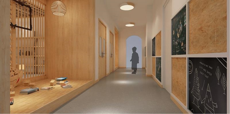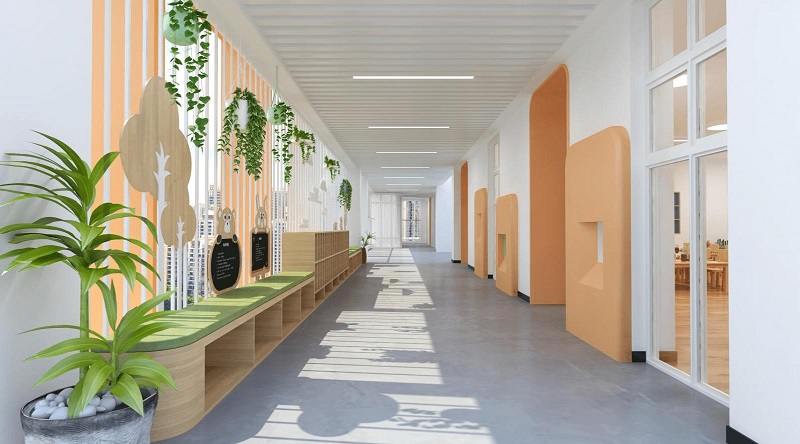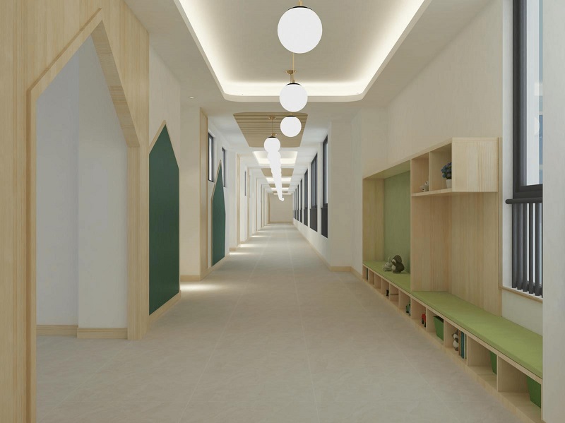 走廊本身的作用主要是通行,很多時候幼兒會在走廊空間嬉戲打鬧,在走廊空間設(shè)置一些沙發(fā),底部可作為每個教室的儲物空間,沙發(fā)則可以作為幼兒的休息區(qū),充足的休息空間會吸引需要休息的兒童停下腳步,不管是大齡幼兒還是低齡幼兒,為不同年齡段幼兒增加了一些社交的機會。