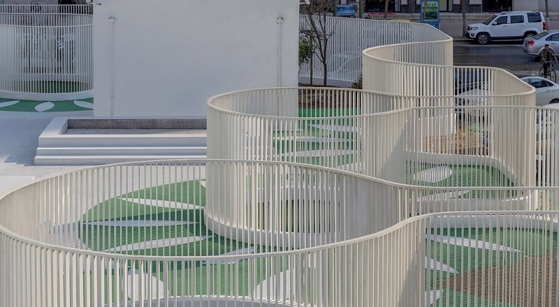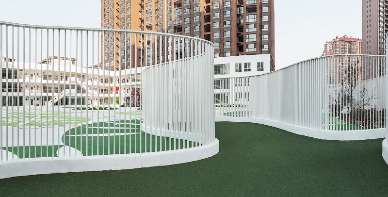 而圍墻使用的是護欄的形式而不是實體墻,通透的視野將社區(qū)和校園鏈接在一起,社區(qū)的人們可以更深入校園,被內部兒童活動時快樂的氛圍所感染,而孩子們也可以通過這樣的圍墻接觸社區(qū)內的人,提高社交能力,也可以通過圍墻,觀察外部的環(huán)境。